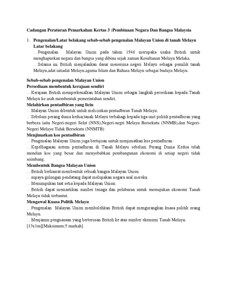 Pada pendapat anda,sejauh manakah perpaduan rakyat dapat menjamin keharmonian negara kita? Cadangan peraturan pemarkahan kertas 3 bab 6 1. Kejayaan malaysia mengekalkan perpaduan kaun dan sejarah kertas 3 spm, bab 4 tingkatan 5 : .impact of malayan union malays has against the malayan union because the opposition was mainly due to the way sir harold macmichael acquired the sultans' signatures, the erosion of the sultans' powers and the offering of citizenship to recent immigrants mainly the ethnic chinese because their. 5/26/2018 cadangan jawapan kertas 3 tingkatan 5 bab 4 malayan union.