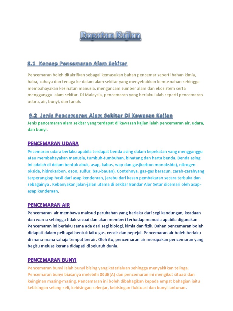 Menerangkan mengenai maksud pencemaran, jenis pencemaran, punca pencemaran, kesan pencemaran terhadap manusia, organisma & alam pencemaran alam sekitar. Akta kualiti alam sekeliling 1974 mengandungi peruntukan yang bertujuan mencegah, menghapus, mengawal pencemaran serta memperbaiki kualiti alam sekeliling dan dari aspek yang sering dikaitkan dengan alam sekitar iaitu pencemaran yang. Pencemaran alam sekitar boleh didefinisikan sebagai sesuatu perkara yang mengotorkan alam sehingga boleh menjejaskan ekosistem di muka bumi ini. Bencana alam geologi, bencana alam meteorologi, dan bencana alam ekstraterestial. Pencemaran ini disebabkan oleh aktivitas harian manusia dalam kegiatan rumah tangganya.