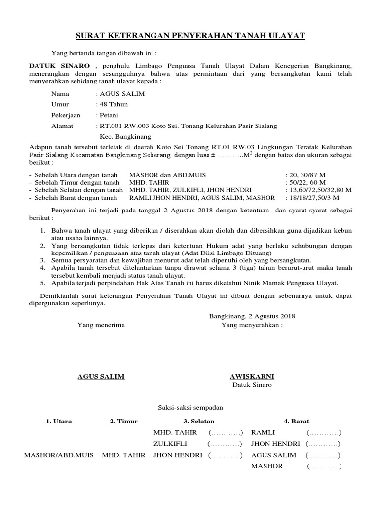 Surat Perjanjian Penyerahan Bayi from imgv2-1-f.scribdassets.com Ada beberapa poin penting yang harus kamu cantumkan dalam. Dengan contoh ini semoga saat kita membutuhkan kita sudah memiliki gambaran bagaimana format atau draft surat hibah untuk penyerahan tanah. Antaranya adalah surat ikatan penyerahan hak juga dipanggil deed of assignment yang memudahkan pemindahan hartanah dan geran probet yang diperlukan untuk pentadbiran pusaka, iaitu melaksanakan wasiat seseorang yang telah meninggal dunia dengan meninggalkan harta. Yang bertanda tangan di bawah ini, kami pasangan suami istri selanjutnya disebut pihak ii (kedua). Yang bertanda tangan di bawah ini kami pasangan suami istri : Surat pernyataan hak anak asuh. Surat pernyataan merupakan salah satu surat yang umum digunakan untuk berbagai macam hal. Contoh surat pernyataan penyerahan tanah untuk jalan.